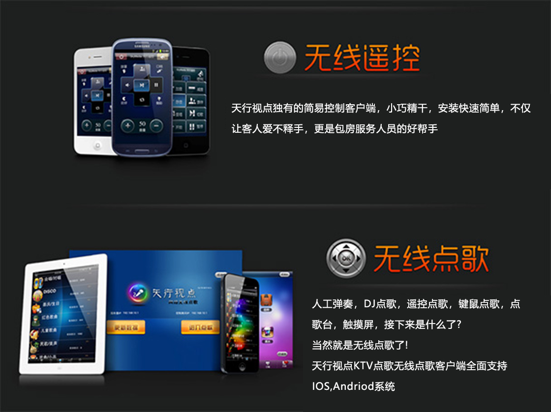 手持遥控、手持点歌、无线WIFI、手持推送、歌曲快进(进度条随意调节)、歌曲预览 、歌曲插播 (置顶+切歌一步到位)、滑屏翻页等功能。